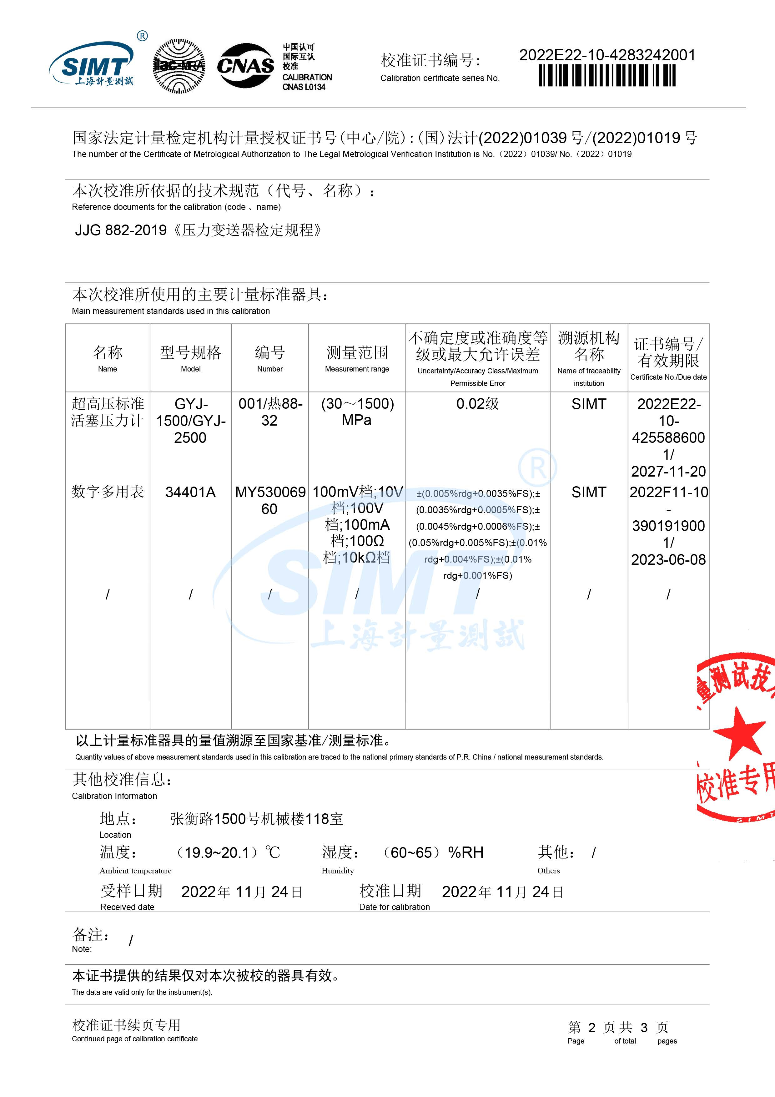 超高壓1000MPa壓力傳感器華東國家計量院檢測通過0.5%FS